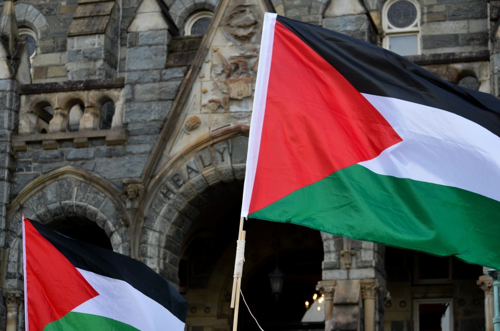 Photo: Flags at a student walkout at Georgetown University, February 8, 2024. Credit: Badreddine Rachidi